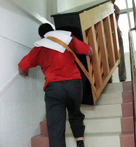 4、如果鋼琴要搬上樓,最好也要有四至五個人。首先要保證搬琴人的安全,同時鋼琴不能碰撞、劃蹭,外表的保護重于內(nèi)部。鋼琴的背面朝墻壁,鍵盤朝樓梯的扶手。兩人在下,三人在上,最好用寬布帶挎在肩上兜住鋼琴的車腳。同時用手抓住琴背的把手和鍵盤底下(不能拉鋼琴的腿),抬起鋼琴一鼓作氣搬上一層樓再休息。特別要注意的是,鍵盤的一側(cè)不能碰扶手,車腳不能碰樓梯。到一層樓面拐彎時要當心碰撞、調(diào)整好方向然后再抬起往上搬。進房門時,也要當心蹭著門框,保證最后安全地把鋼琴放到安排好的位置上。